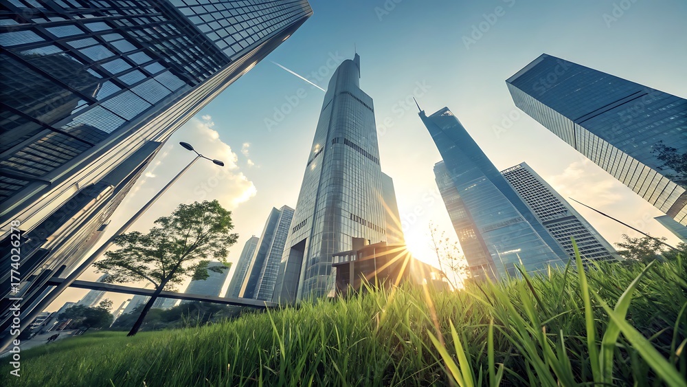 Modern architecture in the city of shanghai with green grass and blue sky, showcasing the beauty of urban development and nature integration in china #1774026278