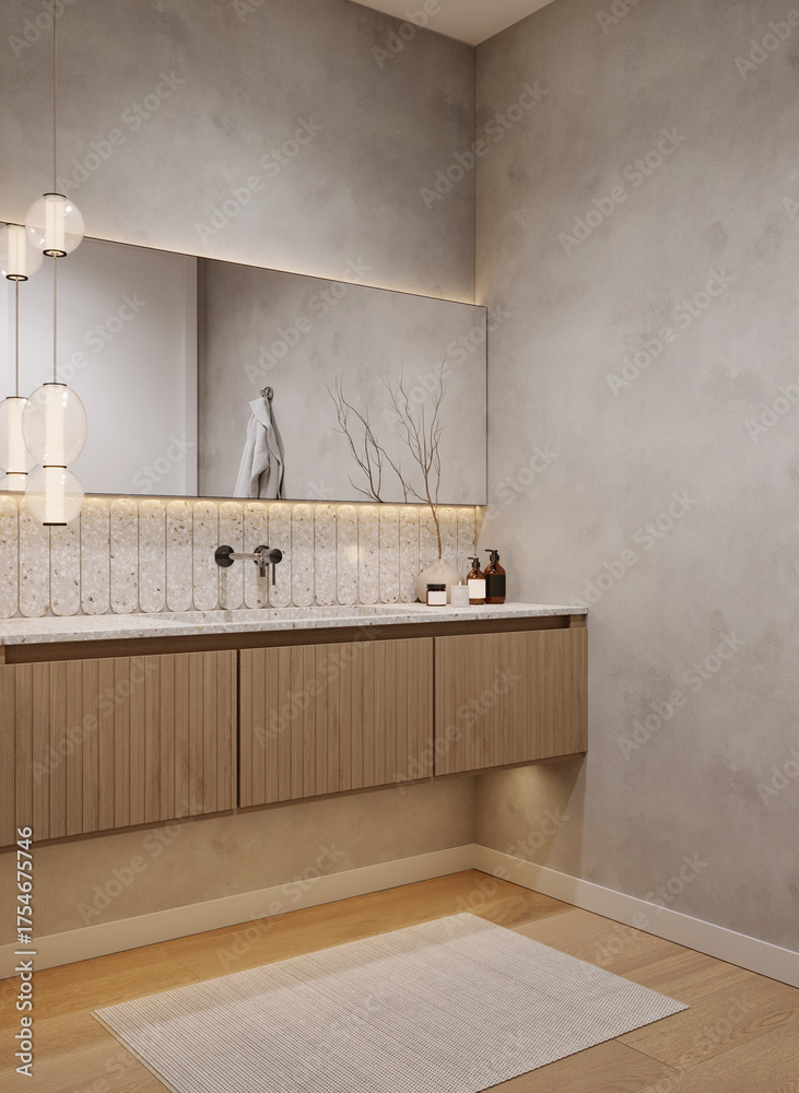 Modern bright bathroom interior with wooden furniture, sink with mirror, 3d rendering #1754675746
