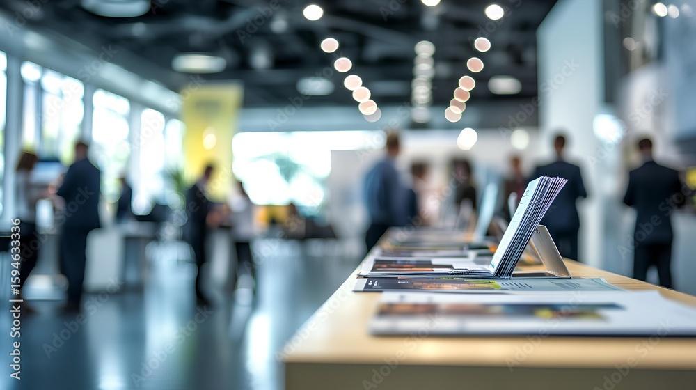 Modern Business Exhibition: A contemporary exhibition space filled with professionals interacting near informational materials. capturing an atmosphere of networking and information exchange. #1594633336