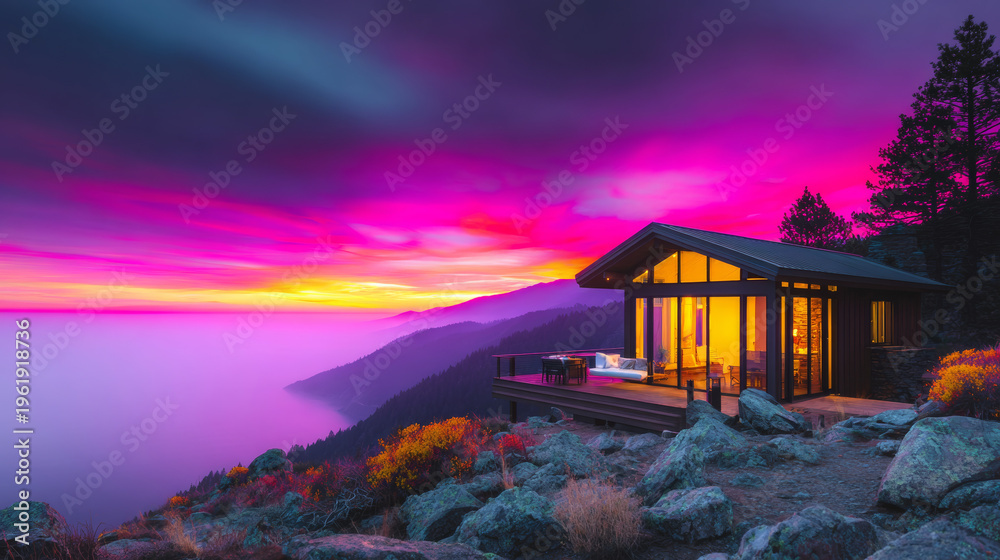 Modern cabin with bright interior light at sunset overlooking vast landscape and colorful sky #1961918736