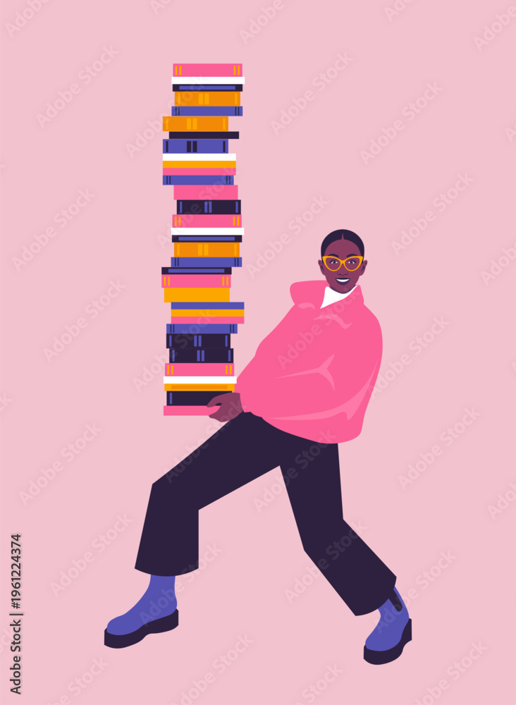 Modern flat vector illustration of a young African student struggling to carry a massive, heavy stack of colorful books. Education, exam preparation, back to school, and academic overload themes. #1961224374