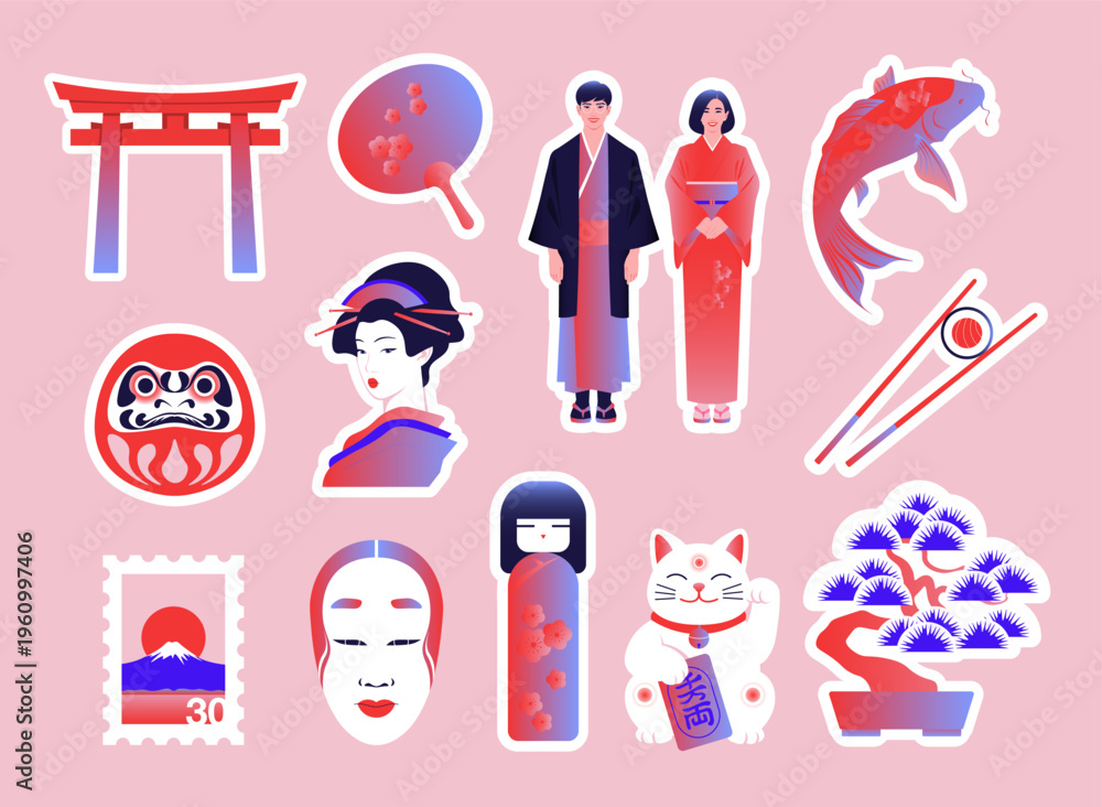 Modern flat vector sticker pack of traditional Japanese cultural elements designed with vibrant gradients and white outlines. Perfect for travel, Asian heritage, scrapbooking, trendy UI and UX project #1960997406