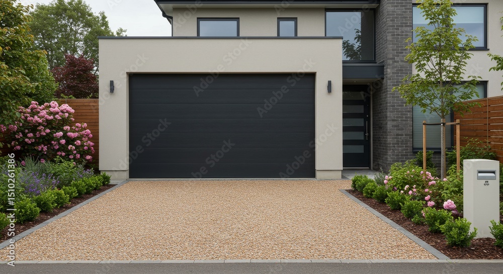Modern Home Garage and Driveway - Stylish modern home with a dark gray garage door and a light beige resin driveway, landscaped garden #1510261386