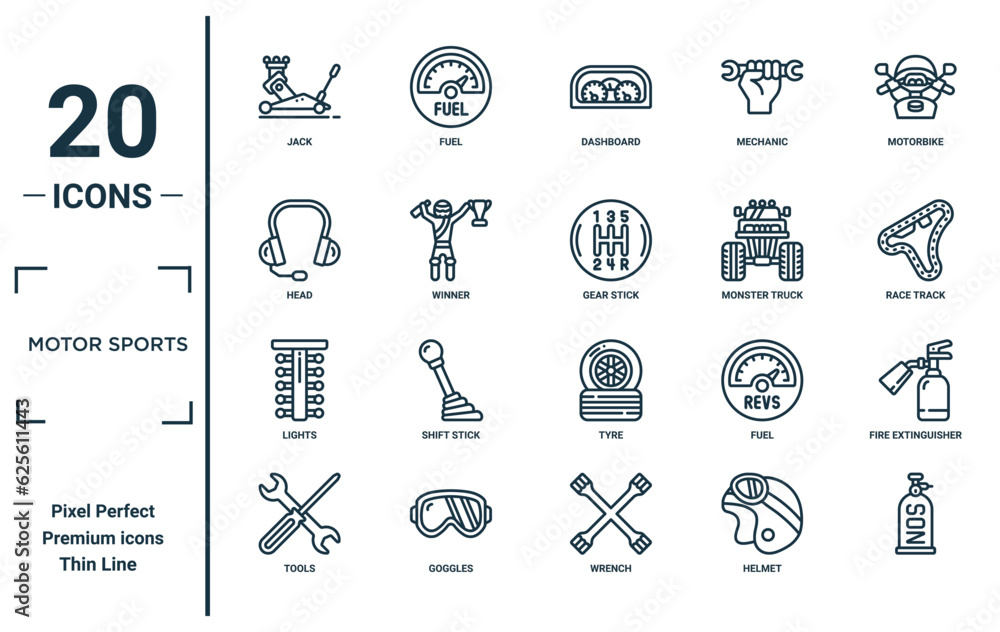 motor sports linear icon set. includes thin line jack, head, lights, tools, , gear stick, fire extinguisher icons for report, presentation, diagram, web design #625611443