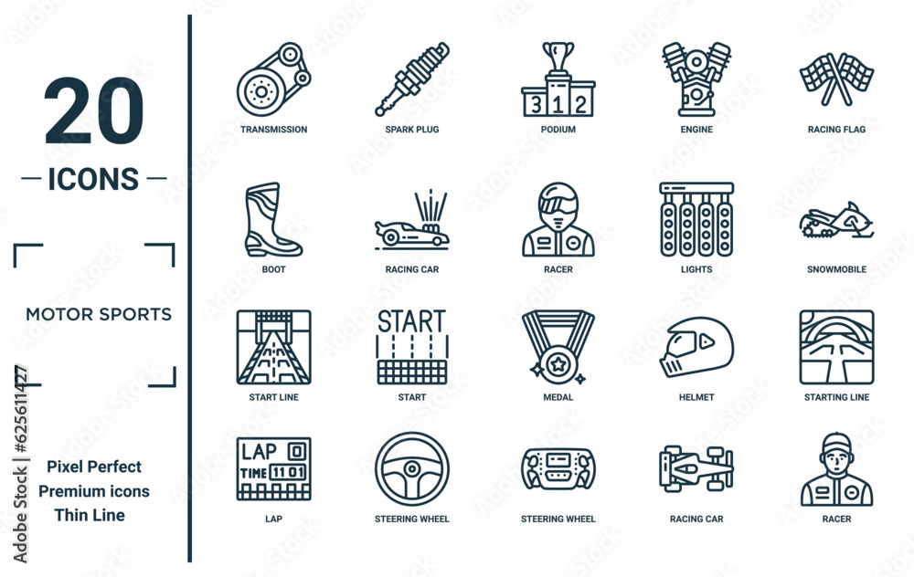 motor sports linear icon set. includes thin line transmission, boot, start line, lap, racer, racer, starting line icons for report, presentation, diagram, web design #625611427