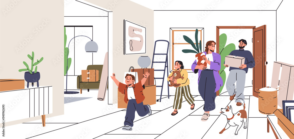Moving into new house. Happy family entering home interior. Parents and kids with boxes, plant and dog pet. Mother, father and children in relocation to apartment. Flat vector illustration #1949962690