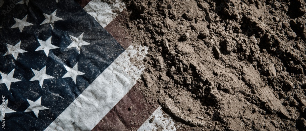National flag partially buried under dry soil representing international relations and geopolitical conflict or environmental impact with copy space on the ground #1904298987
