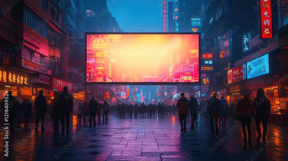 Neon Cityscape at Dusk: A Digital Billboard Reflects Urban Life #1218409529