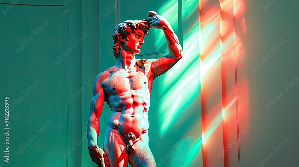 Non-real Statue of David illuminated in Italian flag colors with a vibrant marble surface #982213395