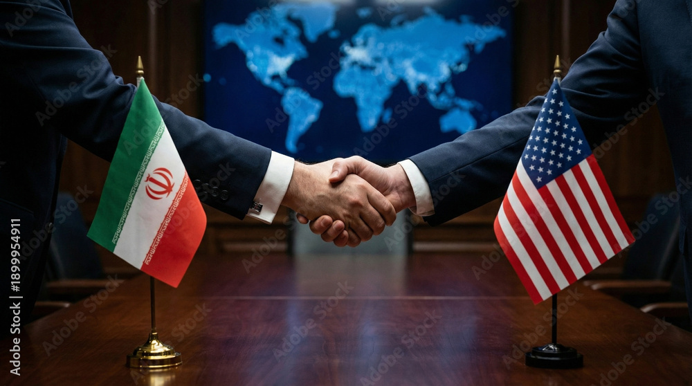 Official handshake of diplomats between USA and Iran with world map background #1899954911
