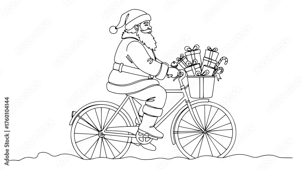 One continuous line drawing of Santa Claus riding a bicycle with a basket full of gifts. #1760104144
