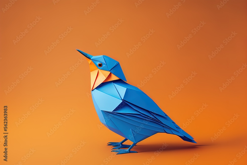 Origami Bird in Blue, Copy Space on an Orange Background. Folded paper bird in modern style. Generative AI #562363983