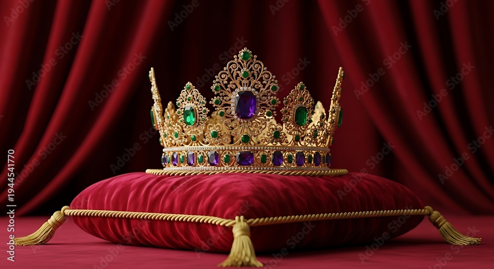 Ornate golden crown with jewels atop a red pillow, against a draped red backdrop #1944541770