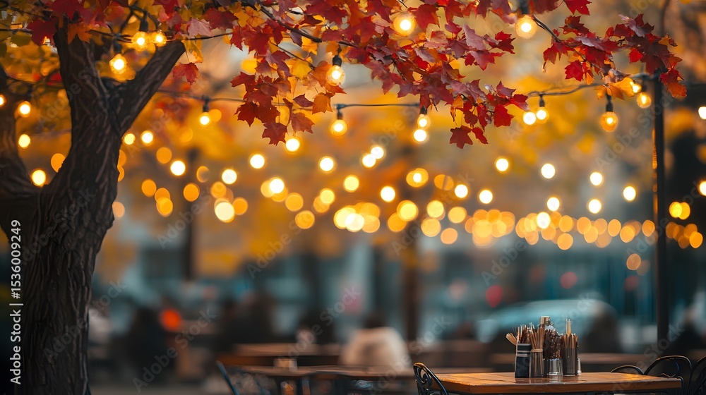 Outdoor cafe scene at twilight, with warm lighting and autumn leaves. #1536009249