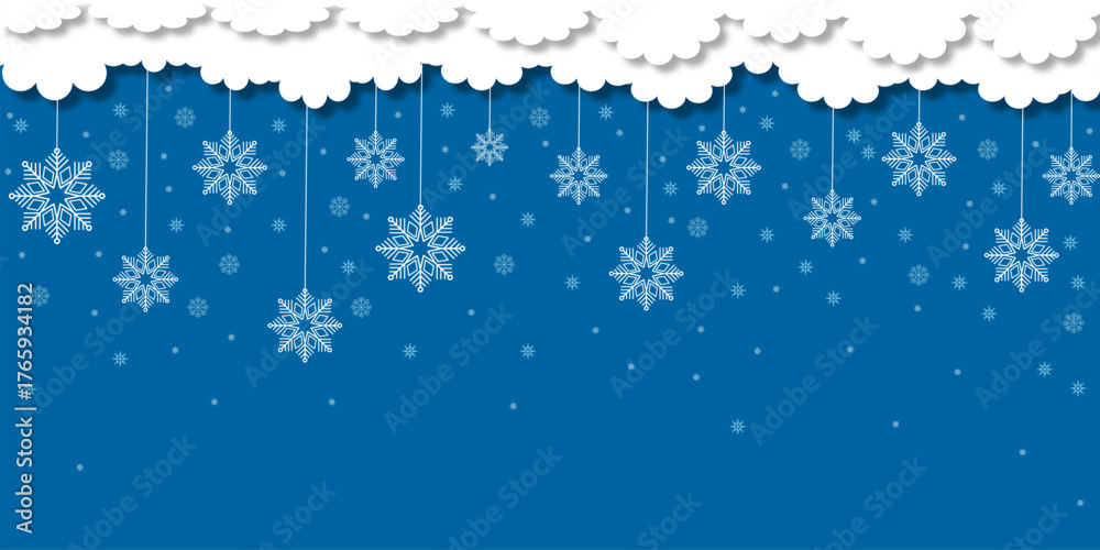 Paper cut clouds with snowflakes on blue sky background. Snowy winter holiday banner for Christmas and New Year Design. Vector eps #1765934182