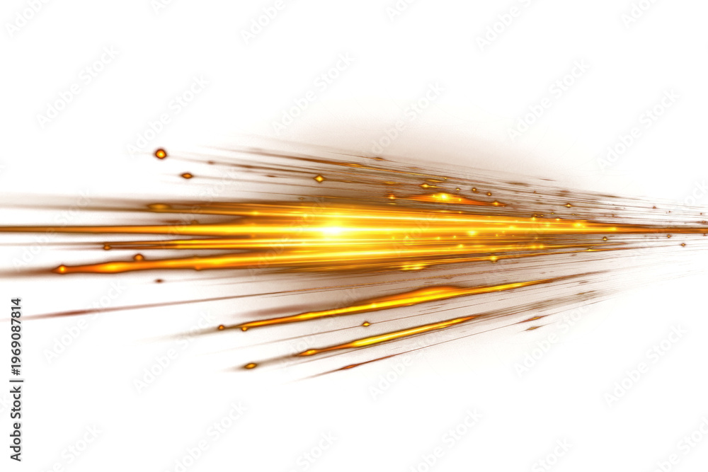 Perspective golden light trails zooming into distance on black background with bright flare #1969087814