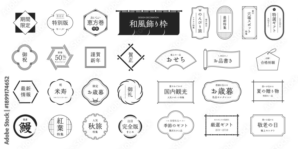 モノクロの和風のフレームの装飾セット 白黒 飾り枠 飾り罫 装飾 あしらい ベクター #1899174652