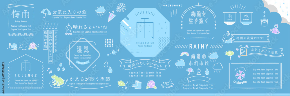 梅雨の自然のあしらいとフレームデザインアイデアセット【青背景】 #1957984495