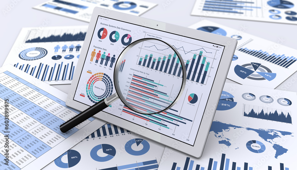 ビジネス資料を背景にデータを表示するタブレット端末を虫眼鏡で調べる、データ分析イメージ #603899975