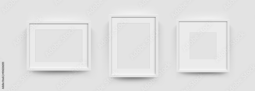 Photo picture frames on wall, vector white mockups or empty posters. Empty photo frames mockups for pictures or photograph, realistic 3D blank templates #436226283