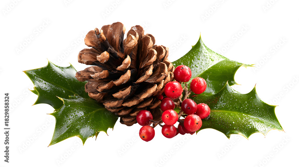 Pinecone and holly berry Christmas decoration composition isolated on white background #1829858324