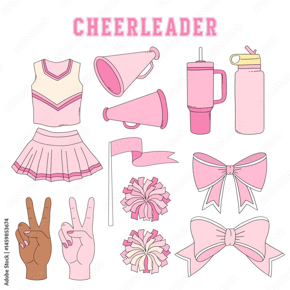 Pink Girlie Cheerleading cheerleader team equipment vector clip-art set isolated on white. Girl Sports Game Season Mom hand drawn illustrations #1459853674