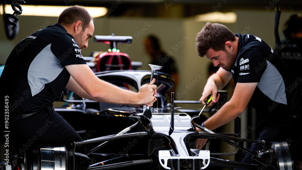 Pit Crew Team Working on Racing Car in Garage for Motorsport Event Preparation and Engineering Display, racing car breakdown and repair, modification of the racing car #1902358495