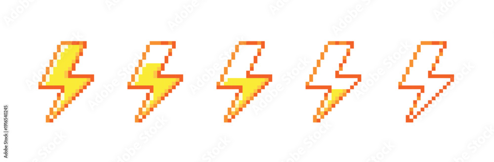 Pixel lightning energy bar. 8bit battery power charge interface indicator, videogame health status. Thunderbolt progress levels. Retro 80s arcade game UI pixelated element. Vector isolated set #1916540245