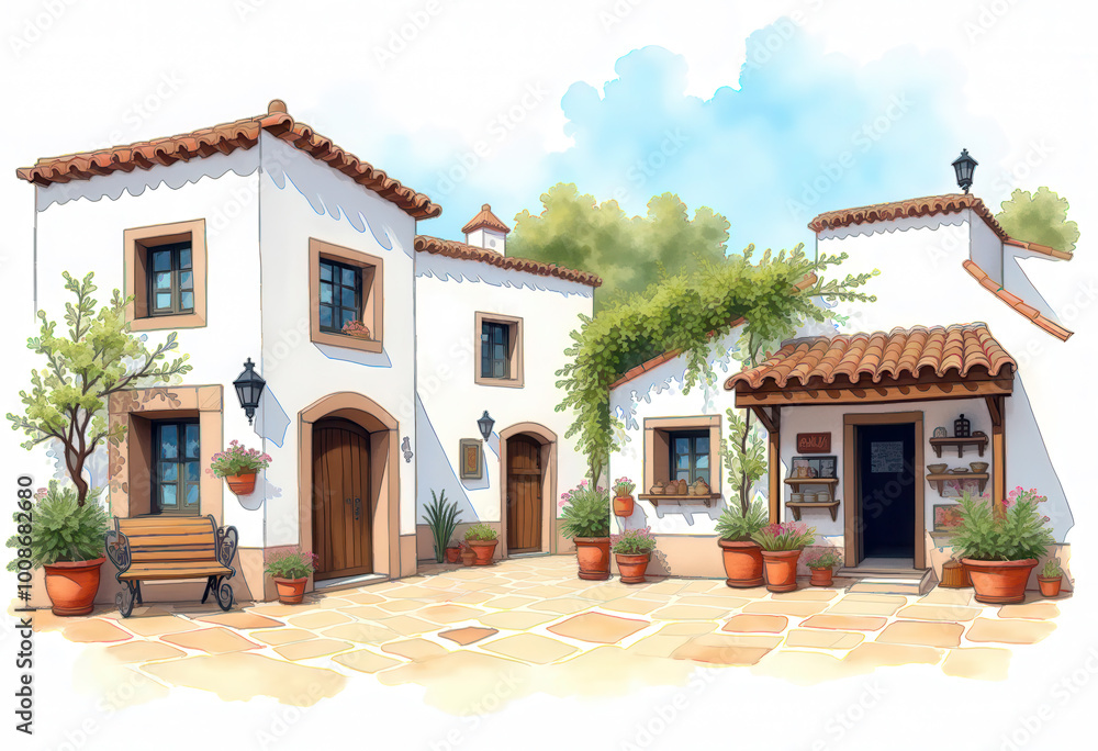 Plaza soleada de un pueblo mediterráneo con casas blancas, macetas y banco de madera. #1008682680