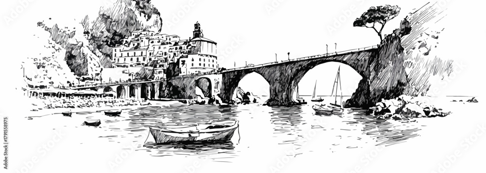 Ponte de pedra antiga sobre rio com barcos e vilarejo pitoresco em estilo de desenho à mão. #1791558975