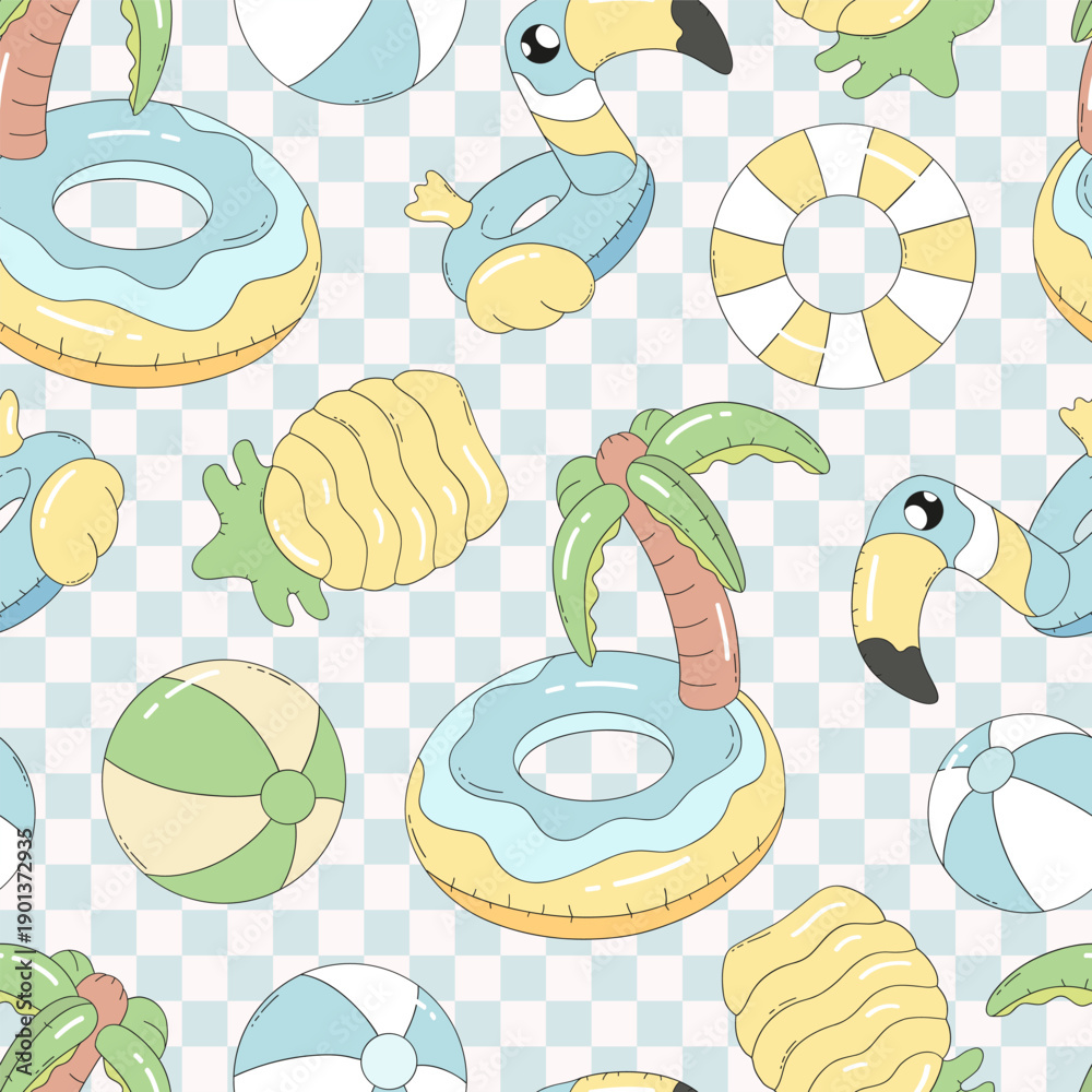 Pool Float Inflatable Seamless Pattern with Flamingo Ring Palm Island Beach Ball Summer Resort Illustration #1901372935