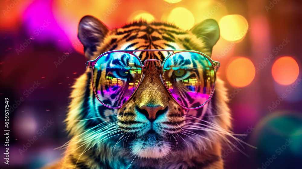 portrait of a gorgeous stylish trendy modern tiger animal in stylish glasses. Black backgorund. Creative portrait in iridescent neon colors, concept photo in neon lighting. AI generated. #609317549