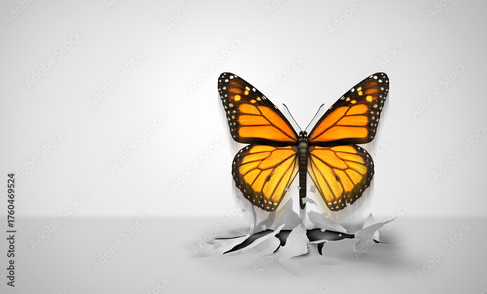 Power Of Hope Symbol as a powerful butterfly blasting out of paper representing the motivational metaphor for believing in possibilities and faith to believe in rising above obstacles. #1760469524