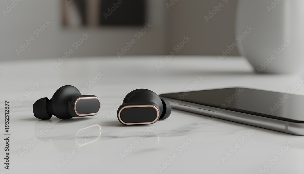 Premium black wireless earbuds resting next to a sleek smartphone on a white marble surface for a modern audio experience concept #1932312677