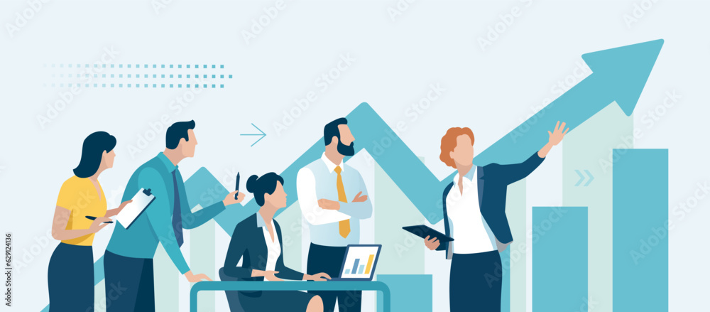 Presentation, vision, strategy . The female leader. Discussing business plan. Vector illustration #629124136