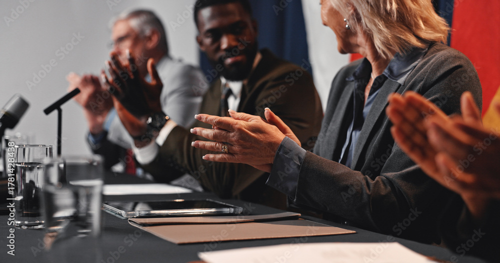 Press conference, applause and hands with group for delegation, international government and panel. Summit, people and politician at speech for diplomacy discussion, global forum or policy update #1781428438