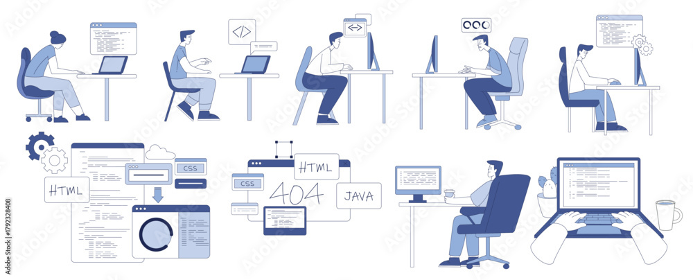 Programming with Man and Woman Character Working on Web and Application Development Vector Set #1792328408