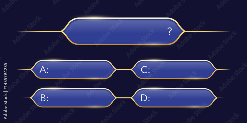 Quiz template. Trivia game layout. Question and answer blue frames with golden border for TV show or social media. Multiple choice test. Vector illustration isolated on dark background. #1455794235