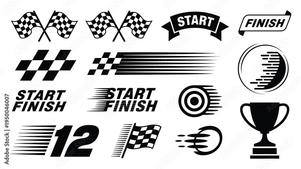 Racing and Competition Icons featuring checkered flags, start-finish lines, speed elements, and winner’s trophy, dynamic vector set for motorsport and sports events illustration. #1950046007
