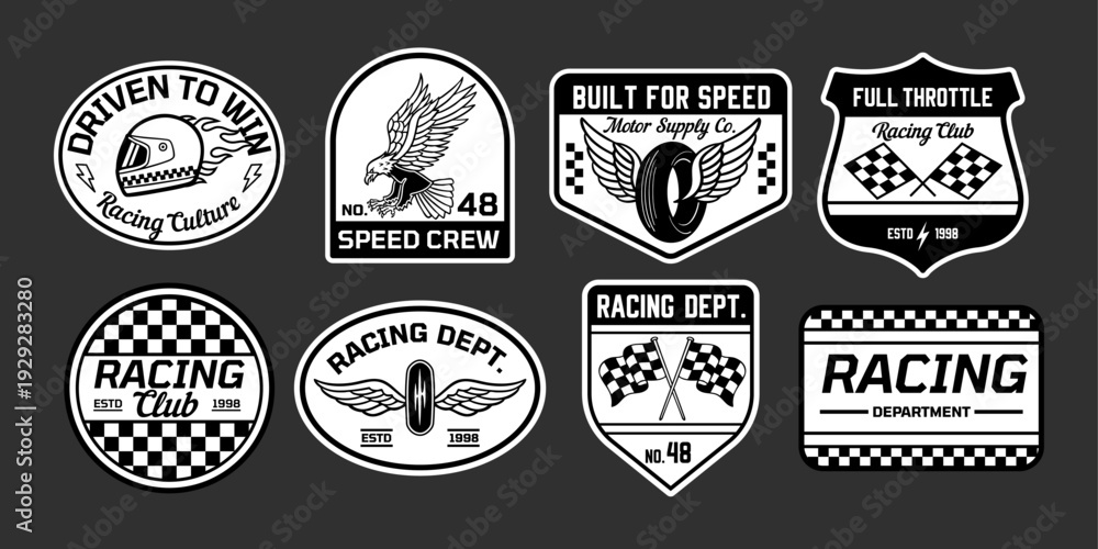 Racing badges vector set with motorsport logos, speed crew emblems, checkered flags, helmets, wings, and retro typography. Perfect for apparel, stickers, branding, and prints. #1929283280