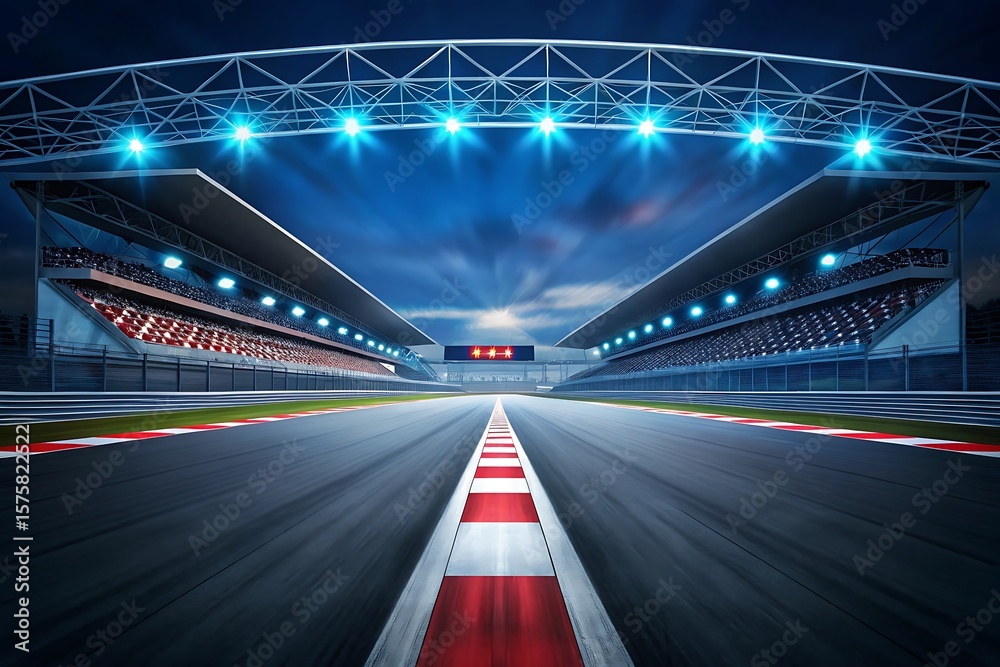 Racing track stadium illuminated by bright blue lights under a dramatic sky speedway asphalt #1575822522