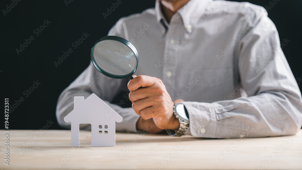 Real estate appraisal for house property, inspector uses magnifying glass to search for home valuation, professional appraiser closely examines asset details for accurate property assessment #1948723311