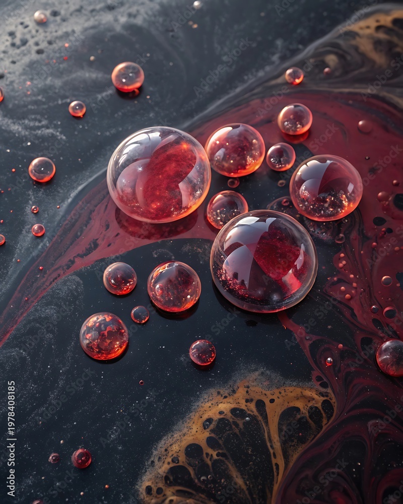 Red bubbles on black and gold liquid background #1978408185