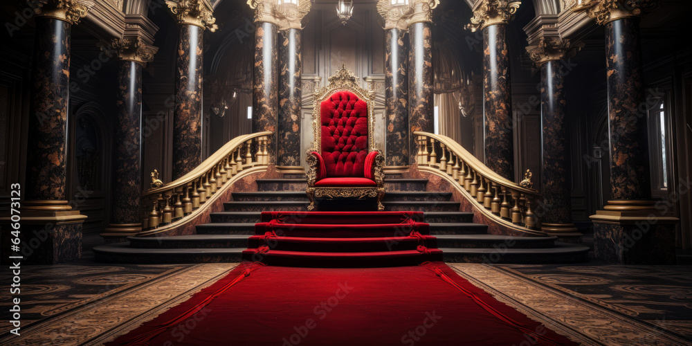 Regal Entrance: Red Carpet Pathway to Royal Thrones within Majestic Castle #646073123