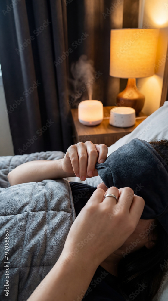 Relaxed person resting with a sleep mask in a cozy room, featuring a diffuser and lamp on the side table. The serene setting creates a calming atmosphere. Image made using Generative AI. #1970588571