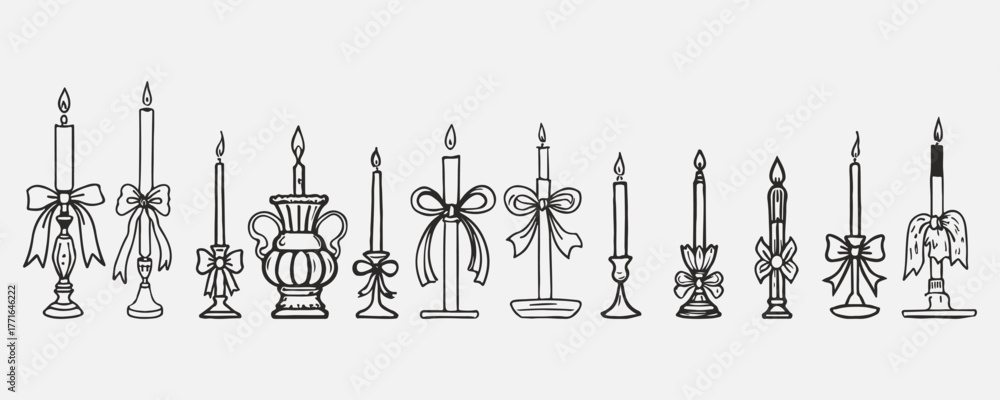 Retro Сandles Set Hand Drawn Sketch Vector Illustration. Vintage Candle for Trendy Creative Design. Candlestick Charcoal Sketch Line Illustration. Vintage Lamp Minimalist Vector Drawing. #1771646222
