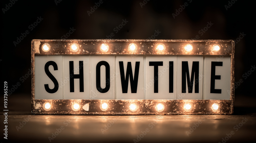 Retro lightbox cinema sign showtime text vintage marquee glowing bulb theater ambiance night mood warm light film theme entertainment concept Retro lightbox cinema sign showtime text vintage #1937365219