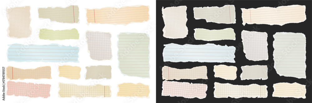 Ripped paper strips. Realistic crumpled paper scraps with torn edges. Shreds of notebook, book or old newspaper pages. Trendy collage elements. Vector illustration. #1784789357