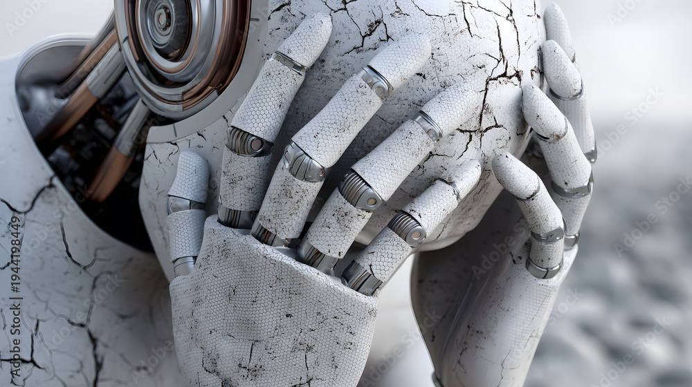 Robot covering face with hands symbolizing artificial intelligence overload, failure or emotional conflict in advanced machine systems. #1944198449
