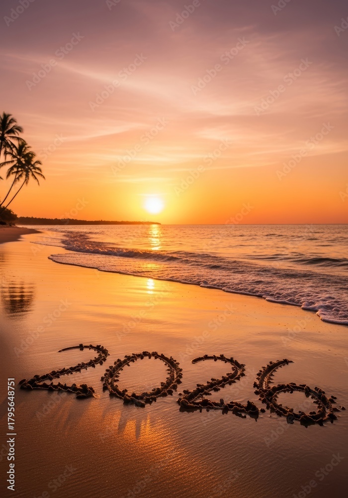 2026 Sand Beach Sunset - Celebrating 2026 on a beautiful beach during sunset. The number 2026 is written in the sand with waves gently lapping the shore #1795648751
